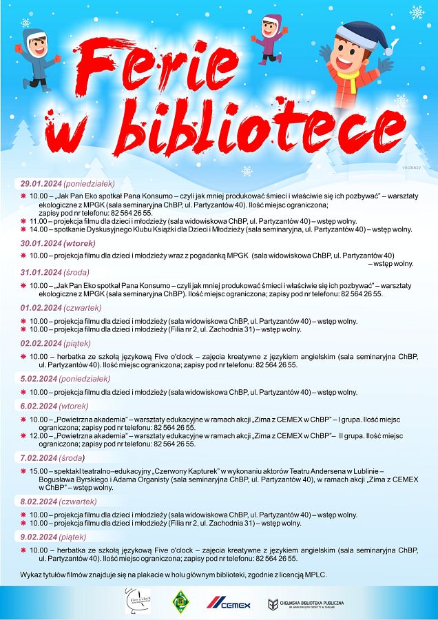 29.01.2024 (poniedziałek) – 10.00 – „Jak Pan Eko spotkał Pana Konsumo – czyli jak mniej produkować śmieci i właściwie się ich pozbywać” – warsztaty ekologiczne z MPGK (sala seminaryjna ChBP, ul. Partyzantów 40). Ilość miejsc ograniczona; zapisy pod nr telefonu: 82 564 26 55; 11.00 – projekcja filmu dla dzieci i młodzieży (sala widowiskowa ChBP, ul. Partyzantów 40) – wstęp wolny; 14.00 – spotkanie Dyskusyjnego Klubu Książki dla Dzieci i Młodzieży (sala seminaryjna, ul. Partyzantów 40) – wstęp wolny.