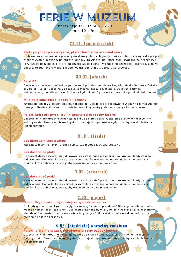 30.01. (wtorek) – ul. lubelska 57, godz. 10.00. bajki prl – spotkanie z najstarszymi kultowymi bajkami polskimi jak: jacek i agatka, gąska balbinka, reksio czy bolek i lolek. uczestnicy podczas spotkania poznają historię powstawania filmów animowanych, sposób ich produkcji oraz będą układać puzzle z motywami z polskich dobranocek. czas trwania: 1,5 godz. grupa docelowa: dzieci w wieku przedszkolnym i szkolnym; ul. Lubelska 57, godz. 11.00 – mitologia słowiańska. Bogowie i Demony – wykład połączony z prezentacją multimedialną. celem jest propagowanie wiedzy na temat wierzeń dawnych Słowian. Uczestnicy rozwiążą quiz i krzyżówkę podsumowującą zdobytą wiedzę. Czas trwania: ok. 1,5 godz. Zajęcia przeznaczone dla młodzieży i dorosłych; ul. lubelska 56a, godz. 9.00 – Pająki, które nie gryzą, czyli niepowtarzalne ozdoby ludowe. Uczestnicy własnoręcznie wykonają ozdoby ze słomy i bibuły, czerpiąc z dawnych tradycji ich wykonywania. Powstaną piękne krystaliczne pająki popularne niegdyś ozdoby wiejskich izb na Lubelszczyźnie. Czas trwania: ok. 1,5 godz. Zajęcia przeznaczone dla dzieci w wieku przedszkolnym i szkolnym.