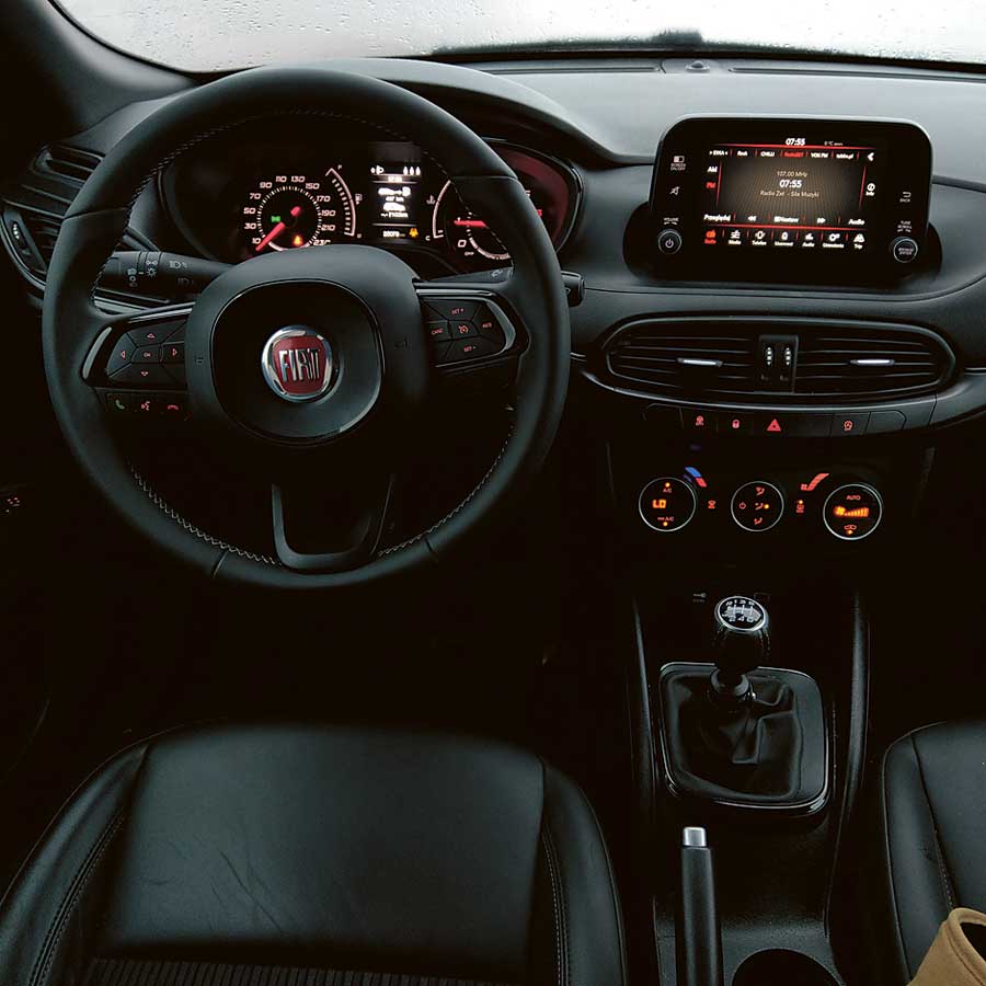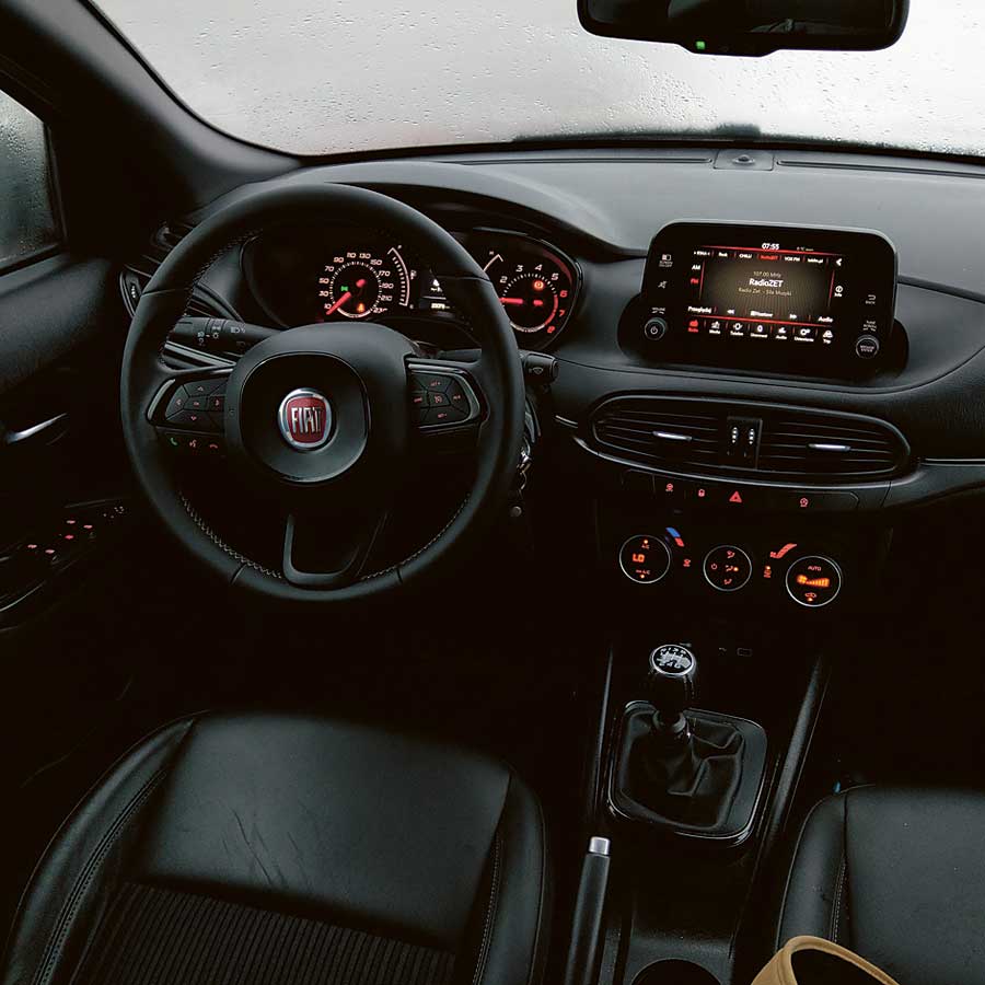 Konstruktorzy przy budowie wnętrza nie sięgali po materiały na najwyższe półki magazynów, ale nie oznacza to, że w Tipo coś trzeszczy czy stuka. Przeciwnie, deska rozdzielcza jest bardzo dobrze spasowana. Ergonomia stoi na bardzo wysokim poziomie – przycisków i pokręteł jest mało, są duże i dobrze opisane, a wszystkimi funkcjami auta steruje się intuicyjnie. Fotele posiadają wystarczający zakres regulacji, z tyłu spokojnie zmieszczą się trzy dorosłe osoby, które nie będą też narzekać na brak miejsca na kolana, czy stopy.