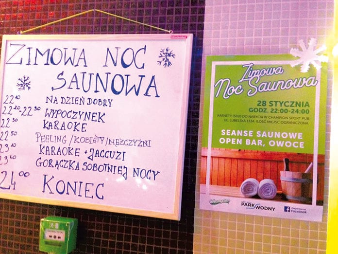 Noce saunowe to stałe punkty oferty większości aquaparków. Dla miłośników sauny to świetna atrakcja. Jest nastrojowa muzyka i klimat. W chełmskim aquaparku też urządzono noc saunową. Zaczęło się spokojnie – od wypoczynku w saunie i w jaccuzi. Zrelaksowani goście poddawali się zabiegom peelingu. Potem impreza się rozkręciła. Panie i panowie, owinięci w ręczniki, oddali się gorączce sobotniej nocy! Półnagi didżej puszczał muzykę, a pomagał mu w tym dyrektor aquaparku, Mirosław Czech. Był bufet z przekąskami i kolorowymi napojami, a w tle romantyczna sceneria na fototapecie – brzeg morza z palmami.