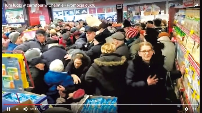 „Ludzie, k***a, zadusicie mnie!”, „Przepuśćcie mnie, k***a, co robicie?”. To, co działo się w chełmskim Carrefourze, przechodzi ludzkie pojęcie. Tłum rozgorączkowanych klientów przepycha się, by dostać się do palet z promocyjnym cukrem. Taranują wszystko, co stoi im na drodze – półki sklepowe, asortyment, a nawet siebie nawzajem. Jedna kobieta podpiera się ręką o półkę, drugą łapie się za serce, ledwo dyszy i patrzy przed siebie błagalnym wzrokiem. Druga kobieta upada pod natarciem pozostałych. Nikt nawet nie zwraca na nią uwagi – ludzie przechodzą po niej i napierają dalej. Klną, rozpychają się łokciami jak opętani i wyrywają sobie z rąk opakowania z białym proszkiem za 1,99 zł. Wystawione również w promocji Pampersy lądują na podłodze. Kompletny chaos, demolka i walka o przetrwanie lub – jak nazwały to ogólnopolskie media „Dantejskie sceny”. To wszystko widać na filmiku, który jeszcze w poniedziałek ukazał się w internecie. Wideo momentalnie stało się hitem „sieci”, a do piątku (24 lutego) miało prawie 600 tys. wyświetleń. Aż trudno uwierzyć, że chodziło tylko o cukier…