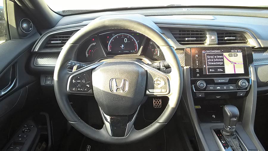 Duży plus dla Hondy za klasyczną, trójramienną kierownicę bez żadnych spłaszczeń, której wieniec ma dla mnie idealną grubość, więc świetnie leży w dłoniach. Kolejnym (dla mnie) atutem Civica są bardzo czytelne zegary z centralnie umieszczonym obrotomierzem, które nie są przeładowane nadmiarem informacji. Taki minimalizm o wiele bardziej do mnie przemawia. Miejsca w Hondzie jest dużo. Fotele jak zwykle są bardzo wygodne. Narzekać nie będą też pasażerowie jadący na tylnej kanapie, szczególnie ci zasiadający na skrajnych miejscach, które są podgrzewane. Bagażnik Hondy pomieści 488 l. Niestety, nie jest regularny. Ma podwójne dno z kilkoma poziomami, a zamiast rolety znajdziemy w nim zwijaną na boki półkę, którą można zamontować zarówno po lewej, jak i po prawej stronie kufra.
