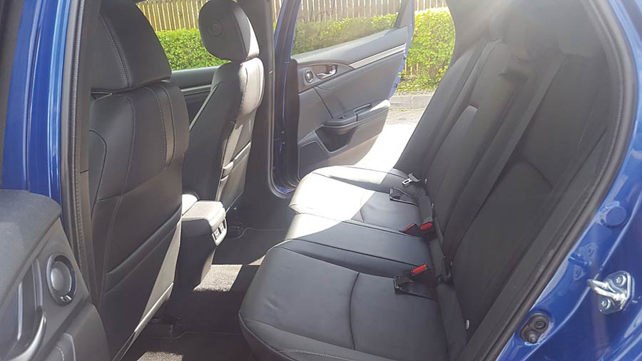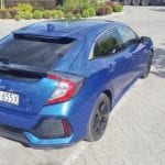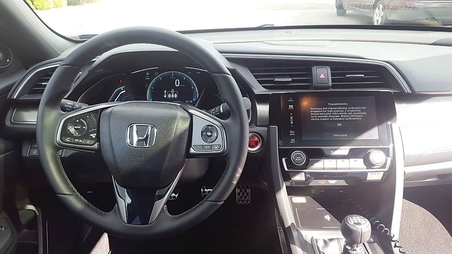 Wnętrze już tak ekstrawaganckie nie jest. Jak to w Hondzie – materiały są czarne lub bardzo ciemne. Dotyczy to zarówno tapicerki, jak i wykończenia deski rozdzielczej. Mam wrażenie, że materiały są nieco gorszej jakości, niż to było w przypadku poprzedniej wersji Civica, który pod tym względem w segmencie zdecydowanie się wyróżniał. Teraz jest dobrze, ale konkurencja też nie pozostaje w tyle. Na słowa uznania niezmiennie zasługuje ergonomia. Wszystko jest na swoim miejscu, przycisków i pokręteł jest mało, a wszystkie znajdują się w zasięgu ręki kierowcy. Niebieskie podświetlenie zegarów i centralnego wyświetlacza jest bardzo miłe dla oka. Duży plus dla Hondy za klasyczną, trójramienną kierownicę bez żadnych spłaszczeń, której wieniec ma dla mnie idealną grubość, więc świetnie leży w dłoniach. Kolejnym (dla mnie) atutem Civica są bardzo czytelne zegary z centralnie umieszczony obrotomierzem, które nie są przeładowane nadmiarem informacji. Taki minimalizm o wiele bardziej do mnie przemawia. Miejsca w Hondzie jest dużo. Fotele jak zwykle są bardzo wygodne. Narzekać nie będą też pasażerowie jadący na tylnej kanapie, szczególnie ci zasiadający na skrajnych miejscach, które są podgrzewane. Bagażnik Hondy pomieści 488 l. Niestety, nie jest regularny. Ma podwójne dno z kilkoma poziomami, a zamiast rolety znajdziemy w nim zwijaną na boki półkę, którą można zamontować zarówno po lewej, jak i po prawej stronie kufra.