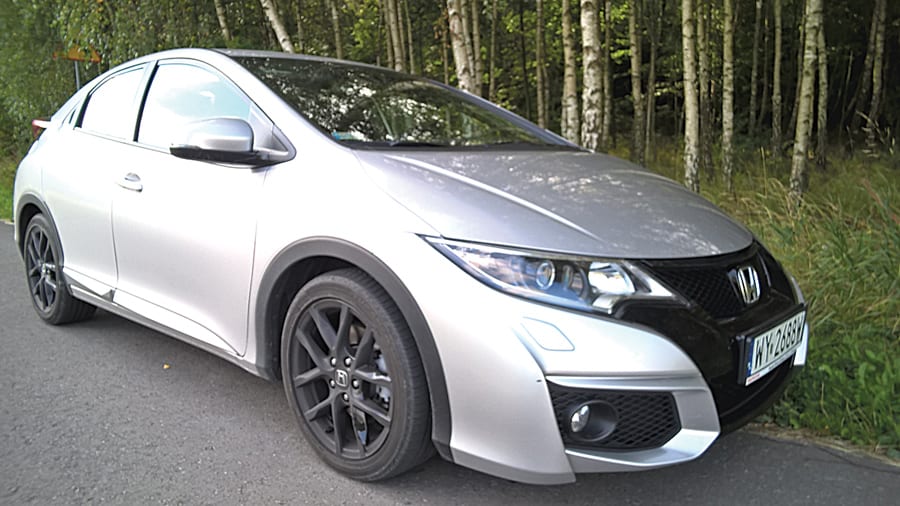 Najbardziej przykuwającym uwagę elementem Hondy Civic jest przedni pas w kształcie litery „V” łączący reflektory, zderzak i atrapę chłodnicy. Dzięki temu japoński kompakt wygląda niezwykle dynamicznie i drapieżnie. Wrażenie to potęguje muskularny zderzak z wielkimi atrapami wlotów powietrza, w których umieszczono cieniutkie światła LED do jazdy dziennej oraz lampy przeciwmgłowe. Całość podkreślają skośne i bardzo wąskie reflektory. Dzieła dopełnia zaś kolorystyka – w tym przypadku najbardziej klasyczna z możliwych – biały lakier zestawiony z czarnymi wstawkami i ciemnymi felgami. We wnętrzu Civica czuć sportowy charakter. Kokpit wygląda rewelacyjnie – wszystkie jego elementy skierowane są ku kierowcy, który od pasażera oddzielony jest dodatkowo wysoką przegrodą z dość pojemnym, zasuwanym schowkiem. Centralny punkt na desce rozdzielczej zajmuje panel radia i klimatyzacji. Tuż pod nim umieszczono dźwignię zmiany biegów, która znajduje się dość wysoko i blisko kierownicy. Tradycją w Civicu jest już wielki, na niebiesko podświetlany wyświetlacz tuż pod przednią szybą. Na nim odczytujemy prędkość i wszelkie wskazania komputera pokładowego. Dopiero pod nim, w trzech głębokich tubach znajdziemy obrotomierz, wskaźnik poziomu paliwa oraz temperatury. Znakomicie wygląda i równie dobrze leży w dłoniach mięsista, skórzana kierownica. Na jej ramionach umieszczono przyciski sterowania radiem, komputerem pokładowym i tempomatem. Co prawda, sterowanie to nie jest intuicyjne, ale po krótkim treningu obsługa komputera nie nastręcza już większych trudności. Drobne zastrzeżenia można mieć natomiast do foteli, w których na próżno szukać regulacji oparcia w części lędźwiowo-krzyżowej, razi też zbyt wąskie oparcie na wysokości barków. Można się jednak do tego przyzwyczaić, tym bardziej, że fotele są wygodne i doskonale trzymają w zakrętach. Każdy też bez problemu znajdzie idealną dla siebie pozycję za kółkiem, w czym wydatnie pomaga duży zakres regulacji fotela i kierownicy. Tak kierowca, jak i pasażerowie nie są w żaden sposób ograniczeni przez brak miejsca, którego nie brakuje nawet z tyłu.