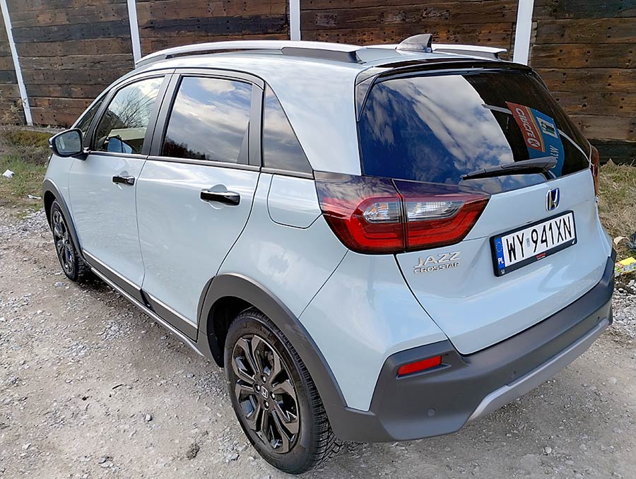 Zwarte, jednobryłowe nadwozie, kształtem przywodzące na myśl mikrovana, krótka maska i duża powierzchnia szyb bocznych to cechy charakterystyczne Jazza Crosstar. Z zewnątrz nie widać żadnych dizajnerskich rozwiązań, z których słynie choćby Civic, ale pamiętajmy, że jest to klasyczne auto miejskie, które ma inne zalety niż przyciągający wzrok wygląd.