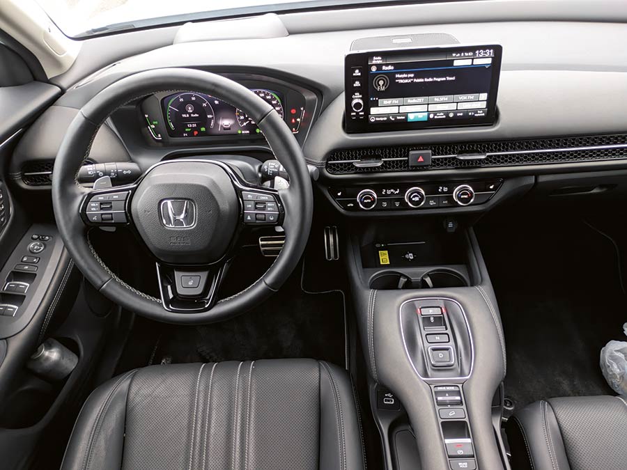 Wszystko ułożone w jednej linii i okolone przyjemną ekoskórą. Na dole jest kolejna, duża półka. Wygląda to estetycznie, elegancko i jest wygodne. Miejsca w ZR-V jest sporo, a do tego można je bardzo fajnie konfigurować za pomocą systemu Magic Seats, który pozwala na składanie tylnego siedziska w stosunku 1,3, 2/3 lub całej kanapy. W ten sposób uzyskujemy za fotelami dużą przestrzeń, w której zmieści się rower, lodówka itp. Z kolei po złożeniu oparcia mamy znowu całkowicie płaską przestrzeń pasażerską. Podkreślić należy także świetną widoczność do przodu i na boki, którą uzyskano dzięki bardzo wąskim słupkom przednim oraz cofnięciu lusterek.