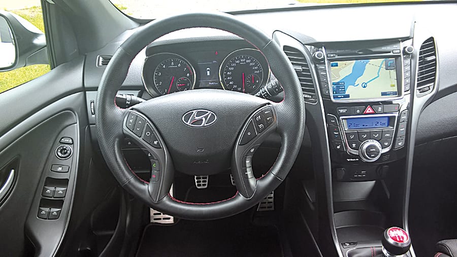 Hyundai i30 to bardzo dopracowane stylistycznie auto. Bez wątpienia jest to jeden z najładniejszych kompaktów. Krótka, zdecydowanie opadająca maska, uwypuklone reflektory oraz wielki wlot powietrza w kształcie odwróconego trapezu zajmujący dużą część zderzaka to znaki rozpoznawcze i30. Z profilu auto wygląda jeszcze lepiej. Masywne nadkola, duża szyba przednia i linia dachu delikatnie opadająca ku tyłowi nadają mu sportowego sznytu, który dodatkowo podkreślają ostre przetłoczenia na linii klamek biegnące od przednich drzwi do tylnych świateł. Z tyłu Hyundai prezentuje się równie dobrze. Ciekawy kształt lamp, mała szyba okraszona spojlerem z wbudowanym światłem stopu oraz plastikowy dół zderzaka i dwie końcówki wydechu sprawiają, że koreański kompakt wyróżnia się z tłumu. Niezaprzeczalnym atutem tego samochodu jest też kabina zbudowana z niezłej jakości materiałów. Słowa uznania należą się jej twórcom za niebagatelny kształt konsoli centralnej, na której znajdziemy bardzo rozbudowany panel sterowania klimatyzacją, a w jej górnej części okalające niewielki wyświetlacz przyciski systemu audio. Plus dla Hyundaia także za podwójne gniazdo zapalniczki i wyjścia AUX oraz USB, które w dzisiejszych czasach powinny być nieodzownym wyposażeniem każdego samochodu. Pozytywne wrażenia wzbudza obszyta skórą kierownica. Ciekawym rozwiązaniem jest umieszczenie na jej dolnych ramionach przycisków do obsługi telefonu i tempomatu, dzięki czemu pod kciukami zostają tylko niezbędne guziki sterowania radiem i komputerem pokładowym. W i30 zastosowano klasyczne, dwutarczowe zegary przedzielone dwoma wyświetlaczami, na których wyświetlane są wszystkie niezbędne informacje o aucie. Zarówno one, jak i wyświetlacze na konsoli centralnej są podświetlone na niebiesko, co wygląda oryginalnie, ale zapewne nie wszystkim przypadnie do gustu. Takich problemów nie powinno być natomiast jeśli chodzi o wygodę podróżowania. Ukontentowani będą szczególnie kierowca i pasażer siedzący obok niego, bo obszyte beżową skórą siedziska nie tylko świetnie wyglądają, ale są bardzo wygodne, a fotel kierowcy posiada szeroki zakres regulacji, dlatego nawet osoby o niestandardowym wzroście powinny bez problemu znaleźć idealną dla siebie pozycję.