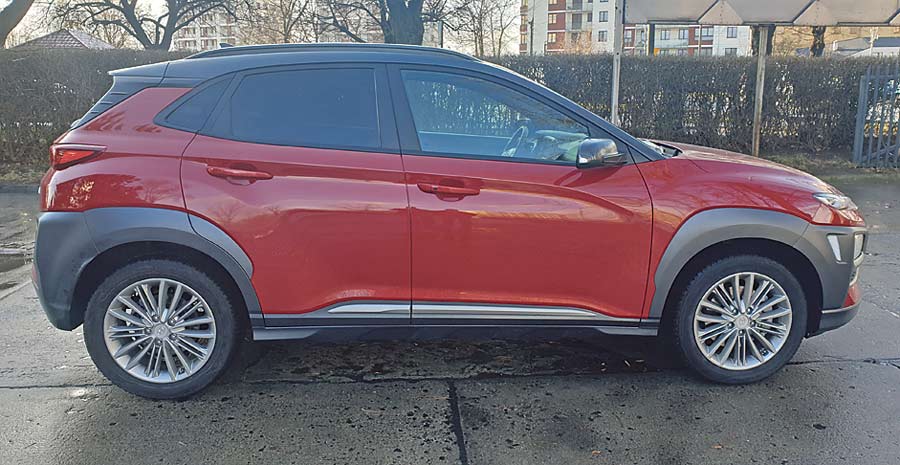 Hyundai Kona to mały crossover, który najlepiej czuje się w mieście, choć jego odmiany czteronapędowe świetnie dadzą też radę poza utwardzonymi szlakami. My mamy jednak wersję z napędzaną przednią osią. Prześwit tego auta to 17 cm, co pozwala podjąć nierówną walkę z wysokimi krawężnikami z nadzieją na wygraną, choć trzeba uważać, bo przedni zderzak Kony wisi nad ziemią dość nisko. Samochód stoi na 17-calowych felgach, cała jego dolna część jest obudowana nakładkami z matowego plastiku, które rozszerzają się na nadkolach, co bardzo mocno odróżnia Konę od konkurencji.