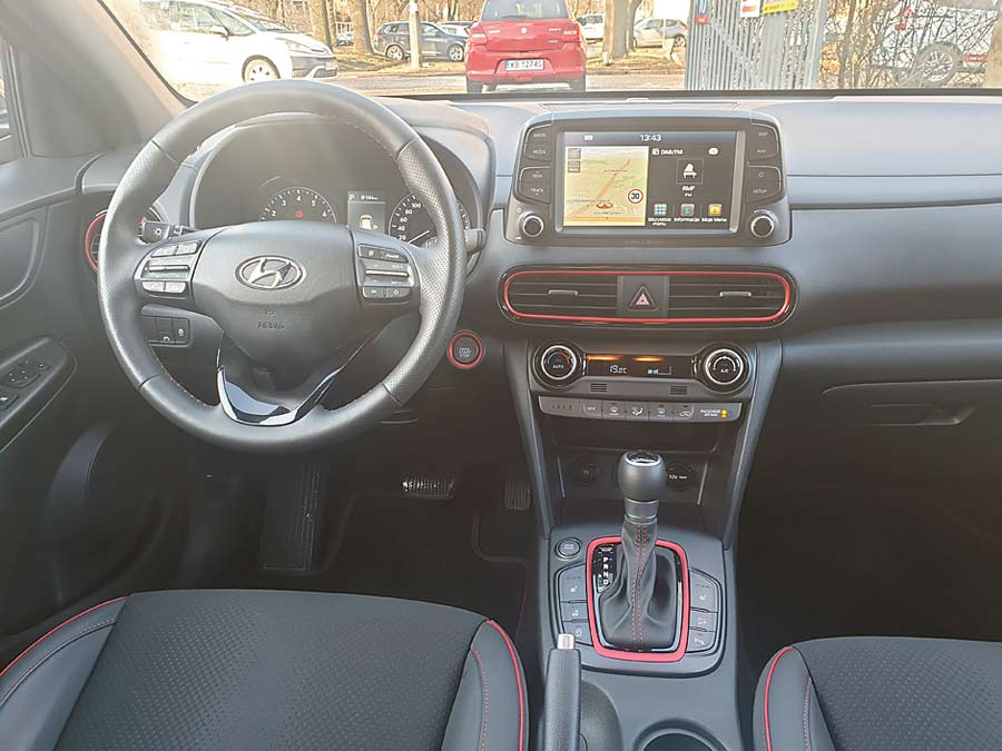 Testowa Kona była wyposażona w najmocniejszy motor dostępny dla tego modelu, czyli w 177-konny silnik benzynowy o pojemności 1,6 litra. Z tą jednostką można zestawić jedynie automatyczną, 7-biegową skrzynię, która działa bardzo wydajnie i szybko reaguje na każde wciśnięcie gazu. Problemem może być jedynie spalanie, które średnio wyniosło ok. 8,5 litra. Ale biorąc pod uwagę osiągi, jakie zapewnia ten samochód, jest ono akceptowalne. Przyspieszenie do 100 km/h to nieco ponad 7 sekund, a więc śmiało można Konę określić mianem crossoverowego hot hatch’a.