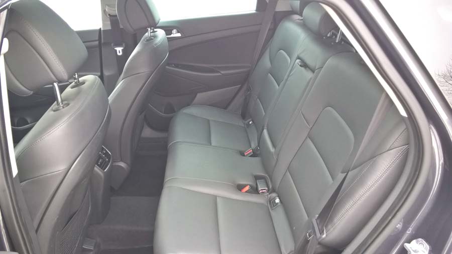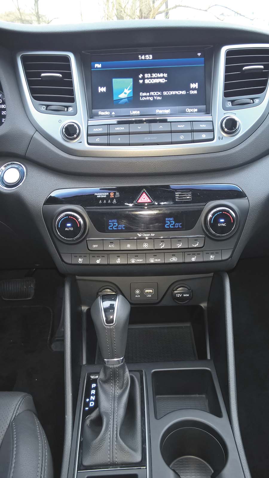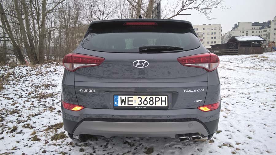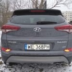 Mimo że od premiery Hyundai Tucsona minęły 3 lata, to auto wciąż prezentuje się bardzo ciekawie. Okrągłe linie, atletyczny przód z potężnym grillem, przetłoczenia na bokach i dopracowany tył z bardzo ciekawymi lampami nadal przyciągają oko. Jeśli do tego dołożymy kapitalne felgi, srebrne dodatki i duży spojler na dachu otrzymamy świetnie wyglądający samochód. Ten „okrągły” styl utrzymany jest też w kabinie. Nowoczesna prostota konsoli środkowej podkreślona jest jej horyzontalnym usytuowaniem, dodającym elegancji i wyrafinowania. Wszystkie siedzenia są podgrzewane i wentylowane, a przednie fotele posiadają też automatyczną regulację. Ergonomicznie zaprojektowana konsola środkowa wyposażona została w duży, nieodbijający światła, 8-calowy ekran będący częścią systemu nawigacji. Ponadto, łączność zapewniają wejścia USB i AUX na konsoli środkowej. Kapitalnym rozwiązaniem jest ich podświetlenie, więc po zmroku nie ma najmniejszego problemu z trafieniem w gniazdo. Hyundai Tucson został zbudowany na nowej platformie, dzięki czemu powiększyła się przestrzeń wewnątrz samochodu. Pojemność bagażnika wynosi 513 litrów, przy wszystkich siedzeniach w pozycji pionowej. Wśród nowych elementów zwiększających komfort codziennego użytkowania modelu Tucson znalazły się: inteligentnie otwierana klapa tylna, elektryczny hamulec postojowy oraz inteligentny system wspomagający parkowanie (SPAS) z funkcją parkowania równoległego i prostopadłego.