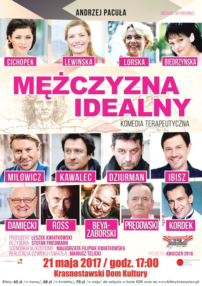 Krasnostawski Dom Kultury zaprasza 21 maja o 17.00 na spektakl w gwiazdorskiej obsadzie! W „Mężczyźnie idealnym” w reżyserii Stefana Friedmana zagrają m. in.: Jacek Kawalec, Krzysztof Ibisz, Katarzyna Cichopek, Małgorzata Lewińska, Ewa Lorska, Mateusz Damięcki, Dariusz Kordek, Michał Milowicz, Adrianna Biedrzyńska, Piotr Pręgowski i Dariusz Ross.