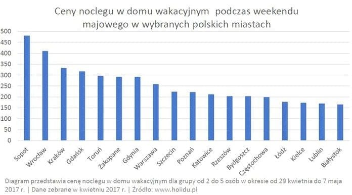 Majowy weekend to dla wielu osób idealny czas na zwiedzanie polskich miast. Odnośnie cen, podobnie jak w przypadku regionów, najdrożej jest nad morzem. W Gdańsku zapłacimy 317 zł, a w Gdyni 292 zł. Wszyscy, którzy chcieliby zwiedzić Wrocław, także muszą przygotować się na spory wydatek – noc we wrocławskim apartamencie wakacyjnym to wydatek rzędu 410 zł.
