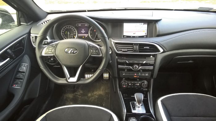 Infiniti bez dwóch zdań przyciąga uwagę. W kształcie nadwozia od razu widać japońską szkołę designu. Ostre linie i przetłoczenia, agresywna atrapa chłodnicy i kapitalne proporcje przypominają nieco Mazdę 3. Dzięki takim kształtom Q30 wyróżnia się z tłumu. O tym, że jest to luksusowy samochód, dowiadujemy się od razu po zajęciu miejsca w kabinie. Rzuca się w oczy wszędobylska skóra, którą obszyto fotele, boki drzwi oraz całą deskę rozdzielczą. Jest miękko i komfortowo, a do tego mamy wrażenie, że kabina jest świetnie wyciszona, jak sala nagrań. O luksusie świadczą też drewniane wstawki na drzwiach i elementach deski rozdzielczej oraz podsufitka i słupki boczne obszyte materiałem przypominającym alcantarę. Kształt deski rozdzielczej, podzielonej na dwie strefy, jest niezwykle ciekawy. Na górze, pod daszkiem, znajdziemy wyświetlacz, niżej – bardzo rozbudowany panel sterowania systemem audio oraz klimatyzacją. Trójramienna kierownica świetnie leży w dłoniach, przez jej obręcz widzimy dwa duże zegary – prędkościomierz i obrotomierz, a pomiędzy nimi wyświetlacz komputera pokładowego. Q30 oferuje wystarczająco dużo miejsca dla czterech dorosłych osób, choć te zasiadające na tylnej kanapie mogą nieco narzekać na zbyt pionowo poprowadzone oparcie.