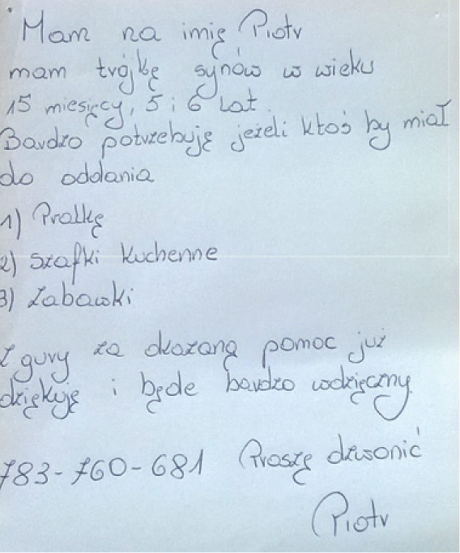 Zaledwie kilka dni temu do Powiatowego Centrum Pomocy Rodzinie przyszedł pan Piotr ze Świdnika, ojciec trzech chłopców w wieku 6 i 5 lat i 15 miesięcy. Przyniósł ze sobą kartkę. Umieścił na niej prośbę o przekazanie szafek, zabawek dla dzieci czy pralki. „Z góry za okazaną pomoc dziękuję i będę bardzo wdzięczny” – napisał na zakończenie swojego apelu.