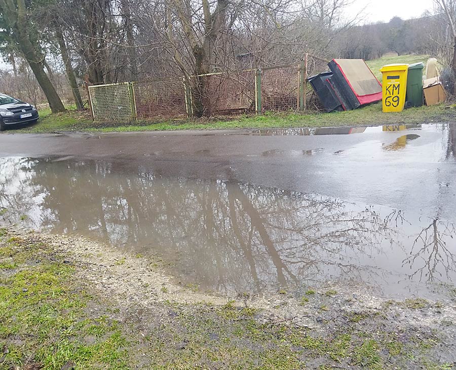 – Kilka lat temu powiat wyremontował nam drogę w Kumowie Majorackim i dokładnie przed moją posesją w asfalcie jest zaniżenie. Po deszczu tworzy się tam ogromna kałuża. Przejeżdżające auta rozchlapują tę brudną wodę na moje ogrodzenie i elewację domu – mówi pan Adam.