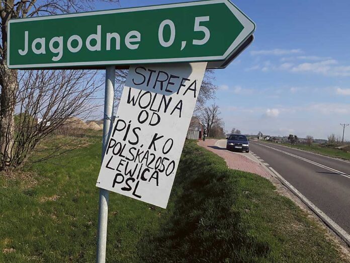 Tymczasem na drogowskazie prowadzącym do wioski, stojącym przy głównej trasie relacji Chełm – Włodawa, ktoś przyczepił transparent o treści „Strefa wolna od PiS, KO, Polska 2050, Lewica, PSL”. Mimo, że plakat jest dość prowizoryczny i odręcznie malowany, to jednak rzuca się w oczy kierowców. Ale nikt nie przyznaje się do jego umieszczenia. – To jakiś idiotyczny wybryk – mówi Andrzej Paszko, sołtys Jagodnego. – Nikt z wioski by czegoś takiego nie powiesił. To jakiś głupi żart albo czyjaś złośliwość.
