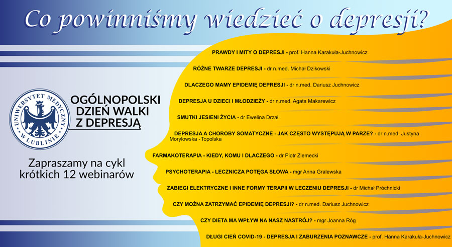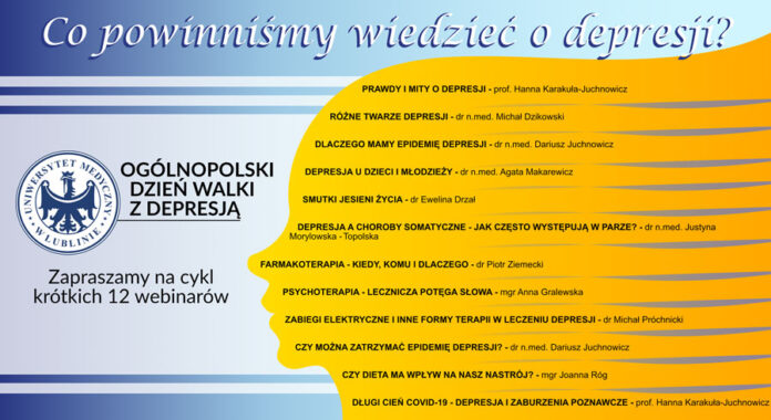 Z okazji obchodzonego 23 lutego Ogólnopolskiego Dnia Walki z Depresją zespół I Kliniki Psychiatrii, Psychoterapii i Wczesnej Interwencji Uniwersytetu Medycznego w Lublinie opracował dostępny dla wszystkich cykl krótkich webinariów przybliżających problematykę depresji.