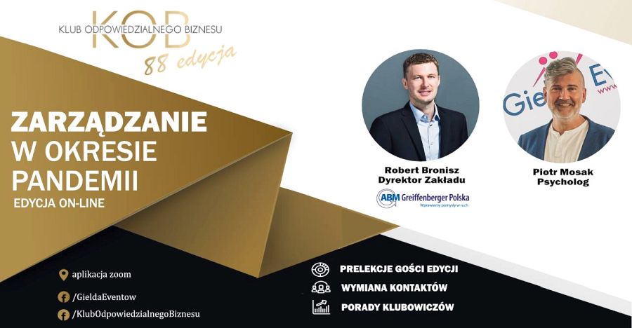 – Tym razem tematem przewodnim spotkania będzie „Zarządzanie w okresie pandemii”. O doświadczeniach w zarządzaniu procesami w firmie w dobie koronawirusa porozmawiamy z gościem 88. edycji, Robertem Broniszem, dyrektorem ABM Greiffenberger Polska Sp. z o.o. Z kolei psycholog Piotr Mosak mówić będzie o zarządzaniu i motywowaniu zespołu w tym trudnym okresie. Serdecznie zapraszamy przedsiębiorców do udziału i bycia z nami przy komputerach – mówi Elżbieta Fikołek, szefowa Giełdy Eventów, założycielka Klubu Odpowiedzialnego Biznesu w Lublinie.