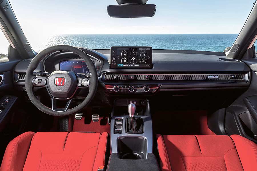 We wnętrzu Civic Type R oferuje ten sam wysoki poziom komfortu, praktyczności i wyrafinowania, co nowy Civic e:HEV, dodatkowo podniesiony na wyższy poziom estetyczny i wzbudzający więcej emocji, dzięki zastosowaniu elementów zorientowanych na wysokie osiągi i wykorzystaniu sugestywnego, klasycznego wykończenia Type R w kolorze karmazynowej czerwieni.