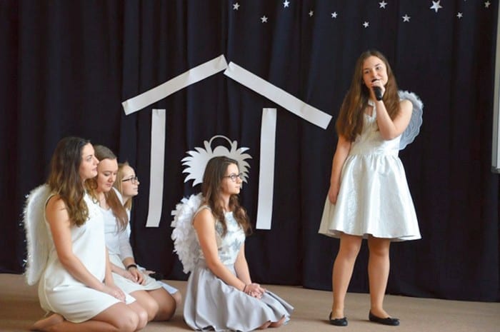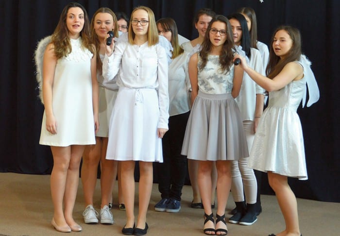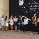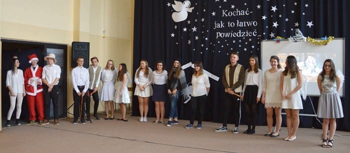 Hasłem przewodnim spotkania był cytat: „Kochać, jak to łatwo powiedzieć”, pochodzący z popularnej piosenki Piotra Szczepanika. Uczniowie, wcielając się w role aniołów i pasterzy pokazali, w jaki sposób ludzie zazwyczaj interpretują fakt Bożego Narodzenia. – Komercyjne reklamy, zmęczeni od przygotowań i porządków domownicy oraz przedświąteczny szał zakupowy okazują się tylko błędną otoczką wokół rzeczywistej istoty tego wyjątkowego czasu – opowiada Agata Mazurek z klasy 2 „c”. – Bohaterowie z humorem wytłumaczyli publiczności, po co tak naprawdę spotykamy się przy wigilijnym stole. (k)