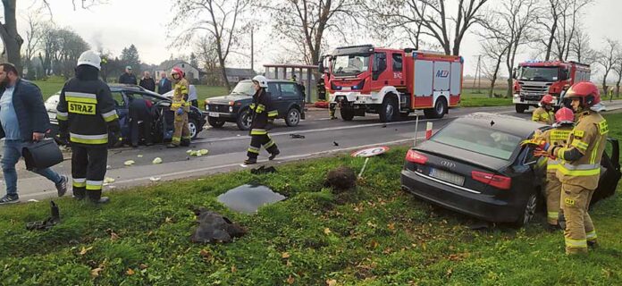 Pierwszy wypadek miał miejsce w Dryszczowie (gm. Żmudź), w poniedziałek (31 października). Zgłoszenie o poszkodowanych w zderzeniu dwóch osobówek na skrzyżowaniu z drogą wojewódzką nr 844 służby ratunkowe odebrały po godzinie 14. Jak wynika ze wstępnych ustaleń, wyjeżdżając z drogi podporządkowanej kierowca Peugeota 206 (59-latek z gminy Żmudź) nie udzielił pierwszeństwa przejazdu kierującemu Audi A6 (42-latek z pow. włodawskiego).