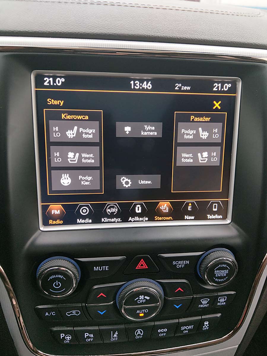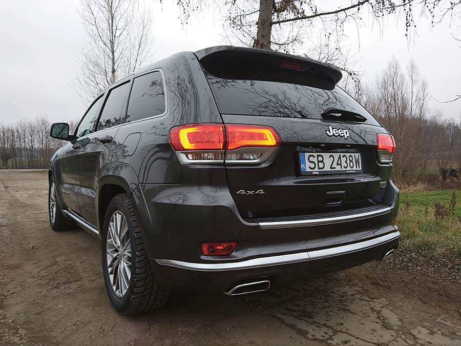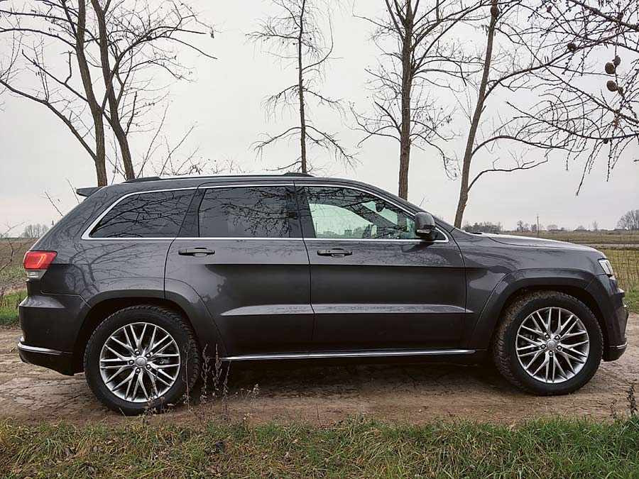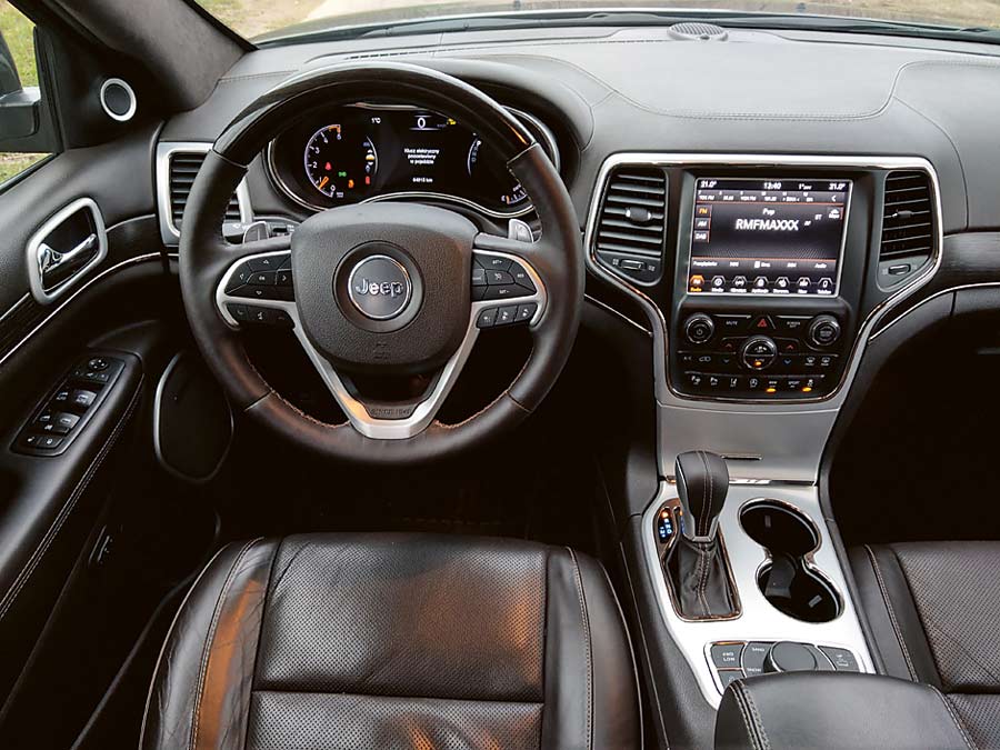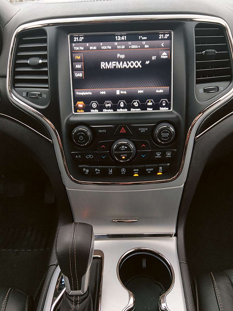 Brak klawiszy skrótowych jest trochę uciążliwy. Jak na luksusowego SUV-a przystało, Grand Cherokee jest wyposażony w całą baterię elektronicznych systemów, z aktywnym tempomatem czy funkcją pozostania na aktualnym pasie ruchu włącznie. Wszystkie działają bez zarzutu. W bagażniku pomieścimy aż 800 litrów bagażu (licząc do linii dachu).