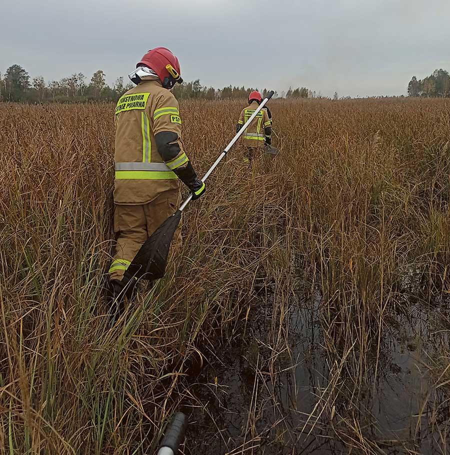 Ze względu na niejednoznaczną lokalizację i trudno dostępny, podmokły teren, strażacy nie mogli podjechać wozem bojowym. Mniej więcej dwukilometrowy odcinek musieli pokonać pieszo z tłumicami w rękach.