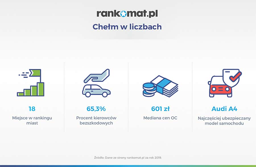 Eksperci rankomat.pl postanowili sprawdzić, ile osób poszukujących taniego OC w ubiegłym roku deklarowało brak szkód w historii ubezpieczenia. – Na liście uwzględnili oni 84 miasta powyżej 50 tys. mieszkańców – mówi Grzegorz Demczyszak z serwisu rankomat.pl. -Kierowcy z Chełma znaleźli się na 18. miejscu – 65,3% z nich zadeklarowało, że w przeszłości nie spowodowało ani kolizji, ani wypadku. Ten sam wynik udało się osiągnąć jeszcze w dwóch innych miastach – Zamościu i Świdnicy.