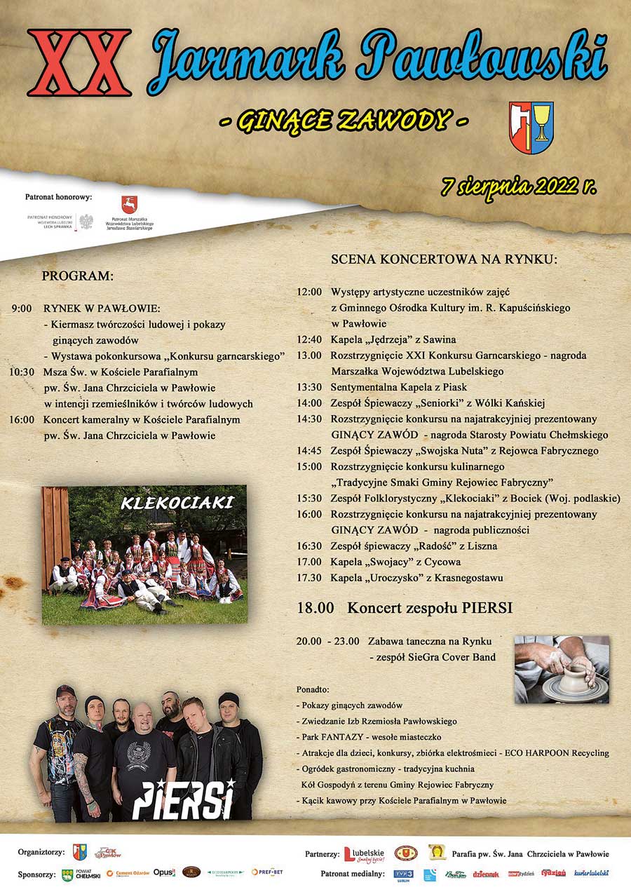 Jarmark Pawłowski to impreza organizowana corocznie w pierwszą niedzielę sierpnia, na wzór staropolskich jarmarków, promujących sztukę i rzemiosło ludowe z Lubelszczyzny. Pawłów od dawna znany jest m.in. z garncarstwa. Przed II wojną światową działał tu prężny i znany ośrodek rzemieślniczy (w latach 1935-36 na nieco ponad 300 gospodarstw około 200 stanowili rzemieślnicy). W połowie lat 30. XX wieku powstała spółdzielnia garncarska „Wyzwolenie”. Na Jarmarku Pawłowski, obok wspomnianego garncarstwa, prezentowane są: bednarstwo, wikliniarstwo, słomkarstwo, haft, a także tradycyjne potrawy. Na scenie pojawią się kapele i zespoły folklorystyczne. W tym roku Jarmark odbędzie się 7 sierpnia. Początek imprezy o godz. 9.00 na Rynku w Pawłowie. Gwiazdą wydarzenia będzie zespół Piersi. (kg)
