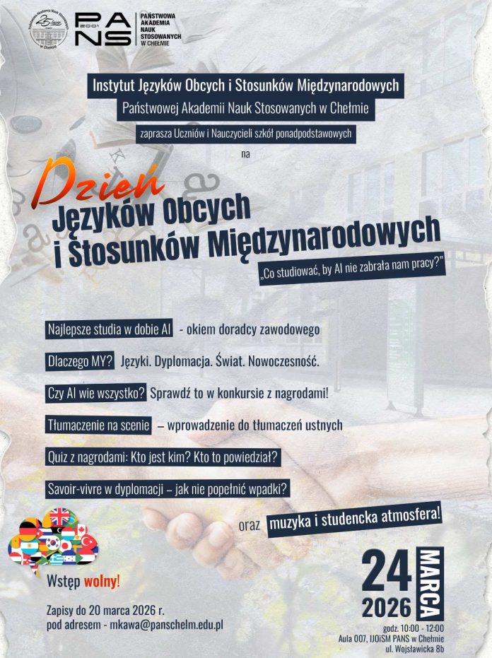 24 marca br. w godzinach 10.00-12.00 swoje drzwi otworzy Instytut Języków Obcych i Stosunków Międzynarodowych Państwowej Akademii Nauk Stosowanych w Chełmie. Wydarzenie, adresowane do młodzieży szkół ponadpodstawowych, będzie okazją do sprawdzenia, czy w świecie nowoczesnych technologii i błyskawicznego dostępu do informacji warto studiować języki obce i stosunki międzynarodowe.