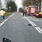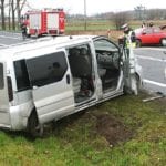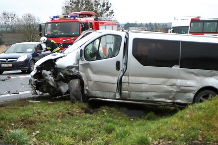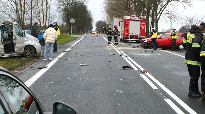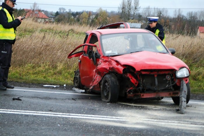 Rozpędzony tir wjechał w skręcającego na zakazie opla. Corsę wyrzuciło na drugi pas, odbiła się od busa i zakręciła kilka razy wokół własnej osi. Rozbite części obu pojazdów fruwały po krajowej „dwunastce”. Świadkowie wypadku w mgnieniu oka pobiegli ratować rannych.