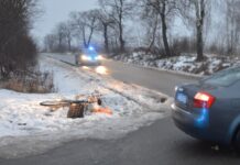 Mimo trudnych warunków na drodze starszy pan wyjechał na trasę rowerem. Pech chciał, że jadący za nim kierowca stracił panowanie nad samochodem i uderzył...