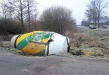 Fragment betoniarki leży przy drodze powiatowej...