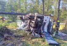 Gdy w trakcie jazdy wystrzeliła opona, tir wypełniony zbożem zjechał do rowu i dachował, wyłamując drzewo.