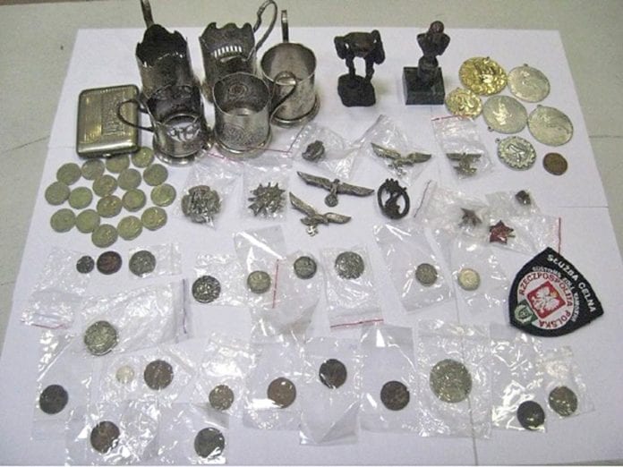 Na dość nietypową przesyłkę funkcjonariusze celno-skarbowi natrafili podczas kontroli autokaru relacji Ukraina – Niemcy. W bagażu jednego z podróżnych, 60-letniego obywatela Niemiec, funkcjonariusze znaleźli m.in. monety z czasów carskich, sportowe medale pamiątkowe oraz emblematy wojskowe z okresu ZSRR, jednorublowe monety z tego samego czasu, emblematy z mundurów wojsk III Rzeszy, a także kilka odznak, statuetek i przedmiotów użytkowych.
