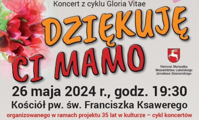 Dziś, 26 maja o 19.30 w kościele pw. Świętego Franciszka Ksawerego w Krasnymstawie odbędzie się kolejny koncert organizowany przez Stowarzyszenie Gloria Vitae. W tym roku wydarzeniu przyświeca hasło „Dziękuję Ci Mamo”.