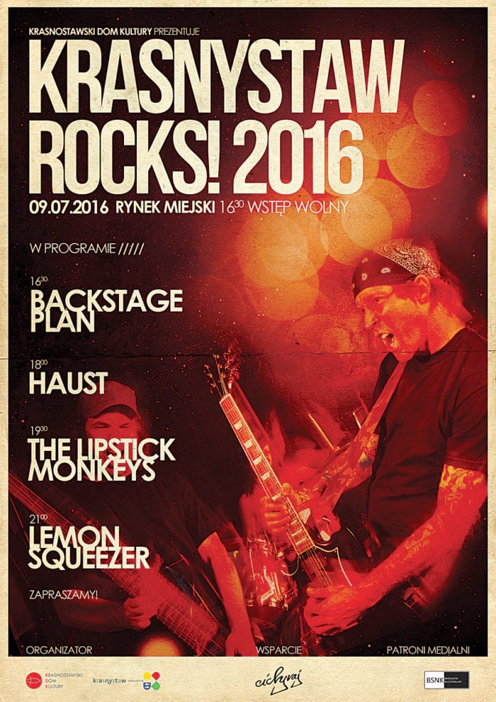 – Impreza ma na celu odkrywanie i promowanie nowych, głównie rockowych zespołów z Lubelszczyzny – zapowiada Dominik Kleszko z KDK. Wydarzenie na trwale wpisało się w kalendarz dużych imprez muzycznych w naszym województwie i już po raz szósty będzie gościć fanów gitarowego grania. W ubiegłych latach w Krasnymstawie zagrały m.in. Mel Tripson, Paravan, Pluton, Mohipisian, The Underground Man czy Logic In Action! – W tym roku w wydarzeniu udział wezmą głównie zespoły z Krasnegostawu: Backstage Plan, Haust i Lemon Squeezer. Rodzynkiem w tym zestawieniu będzie lubelski The Lipstick Monkeys – dodaje Kleszko. Szczegółowy program Krasnystaw Rocks 2016 przedstawia się następująco: 9 lipca (sobota) – 16.30 – Backstage Plan, 18.00 – Haust, 19.30 – The Lipstick Monkeys, 21.00 – Lemon Squeezer. Wstęp wolny. (kg)