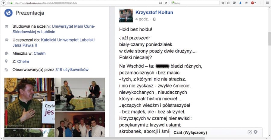 Wszystko rozeszłoby się po kościach, gdyby nie to, że incydent przypadkowo został nagrany przez jedną z uczestniczek marszu. Filmik momentalnie trafił do internetu, a za sprawą udostępnień obejrzały go setki osób. Antykwariusz, który (jak twierdzi) posługuje się piękną polszczyzną, zamiast przeprosić, w przypływie „weny” napisał wiersz o uczestniczkach poniedziałkowego marszu. Laureat wielu nagród poetyckich wszystkie kobiety – w tym żony i matki – wrzucił do jednego worka: „kur**, bladzi różnych, pozamacicznych, zwykłych śmieci i jęczących wiedźm bez majtek”. Wypociny chełmianina szybko zostały usunięte przez administratorów strony, ale większość tych, którzy zdążyli je obejrzeć, zapowiedziała, że nie chce mieć nic wspólnego z takim „poetą”. (pc)