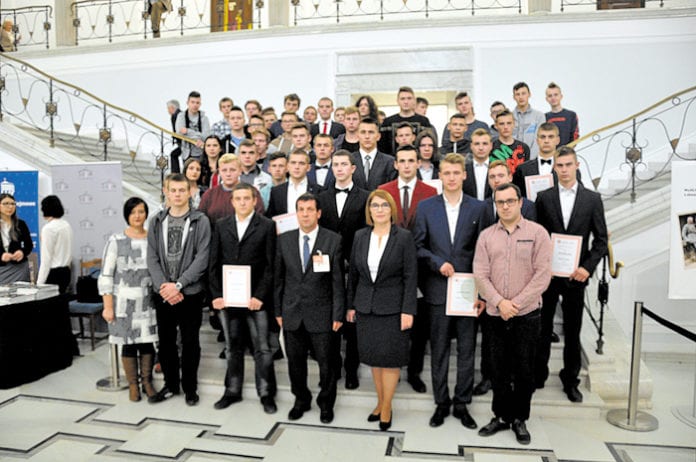 Zwiedzanie Sejmu rozpoczęło się wykładem na temat historii polskiego parlamentaryzmu. Uczniowie mieli okazję zasiąść w ławach galerii Sali Posiedzeń i obserwować odbywające się w tym czasie obrady. Poseł RP Beata Mazurek oprowadziła zwiedzających między innymi po hallu głównym Sejmu, gdzie znajduje się tablica upamiętniająca posłów II Rzeczypospolitej poległych w czasie II wojny światowej. W tym historycznym miejscu pani poseł wręczyła honorowym dawcom krwi: Adrianowi Mrozowi, Dawidowi Łątkowskiemu, Łukaszowi Muraszce, Jakubowi Osuchowskiemu, Krzysztofowi Szponarowi, Bartoszowi Dyciowi, Rafałowi Grabarczukowi, Pawłowi Hulkiewiczowi, Rafałowi Serafinowi, Adrianowi Giergielowi, Kamilowi Litwinowi, Adamowi Połajdowiczowi, Kamilowi Kudrzyckiemu, Jakubowi Szotowi, Mateuszowi Kasprzakowi, Emilowi Abramkowi, Łukaszowi Bochniakowi dyplomy za udział w XIV edycji Ogólnopolskiego Turnieju „Młoda Krew Ratuje Życie”, w którym oddali ponad 128 litrów krwi. – Przechadzając się sejmowymi korytarzami uczniowie mieli możliwość spotkania wielu znanych polityków i dziennikarzy. Dzięki uprzejmości i zaangażowaniu pani poseł Beaty Mazurek wizyta w Sejmie RP i Muzeum Powstania Warszawskiego stała się doskonałą i niepowtarzalną lekcją parlamentaryzmu, historii i patriotyzmu – mówi opiekun grupy, Mariusz Śliwa.
