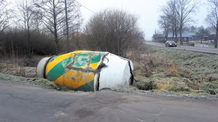 Fragment betoniarki leży przy drodze powiatowej w Chorupniku od kilku miesięcy. „Gruszkę” zgubiła jedna z ciężarówek, która wyłożyła się na skrzyżowaniu z drogą wojewódzką. – Jeżdżę tędy przynamniej raz w tygodniu – mówi nam nasz stały Czytelnik z gminy Gorzków. – Na początku traktowałem ten fragment betoniarki, jako ciekawostkę, byłem pewien, że niedługo zniknie. Mijały jednak tygodnie, miesiące, a ta „gruszka” nadal tam jest.