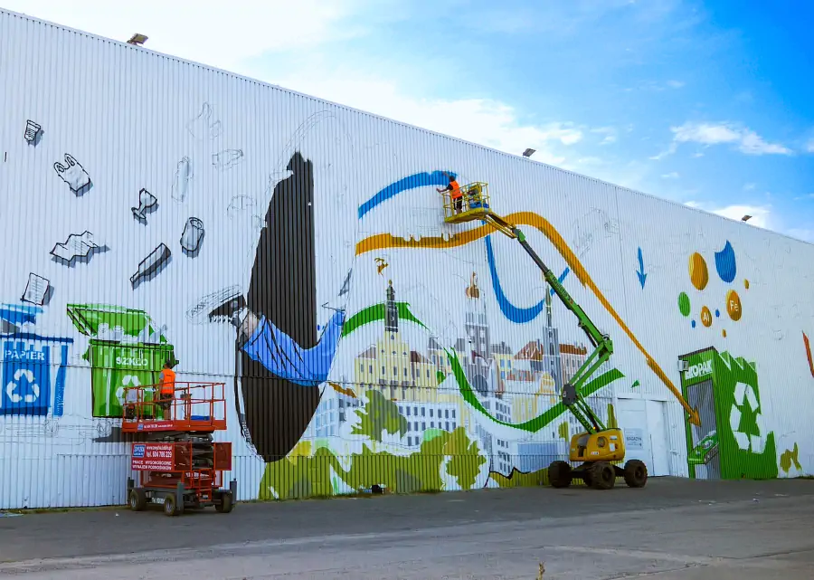 Mural powstaje na ścianie niedawno oddanego do użytku Centrum Recyklingu Ekopak w Lublinie, najnowocześniejszej w południowo-wschodniej Polsce, w pełni zautomatyzowanej instalacji sortowania odpadów i odzysku surowców wtórnych.