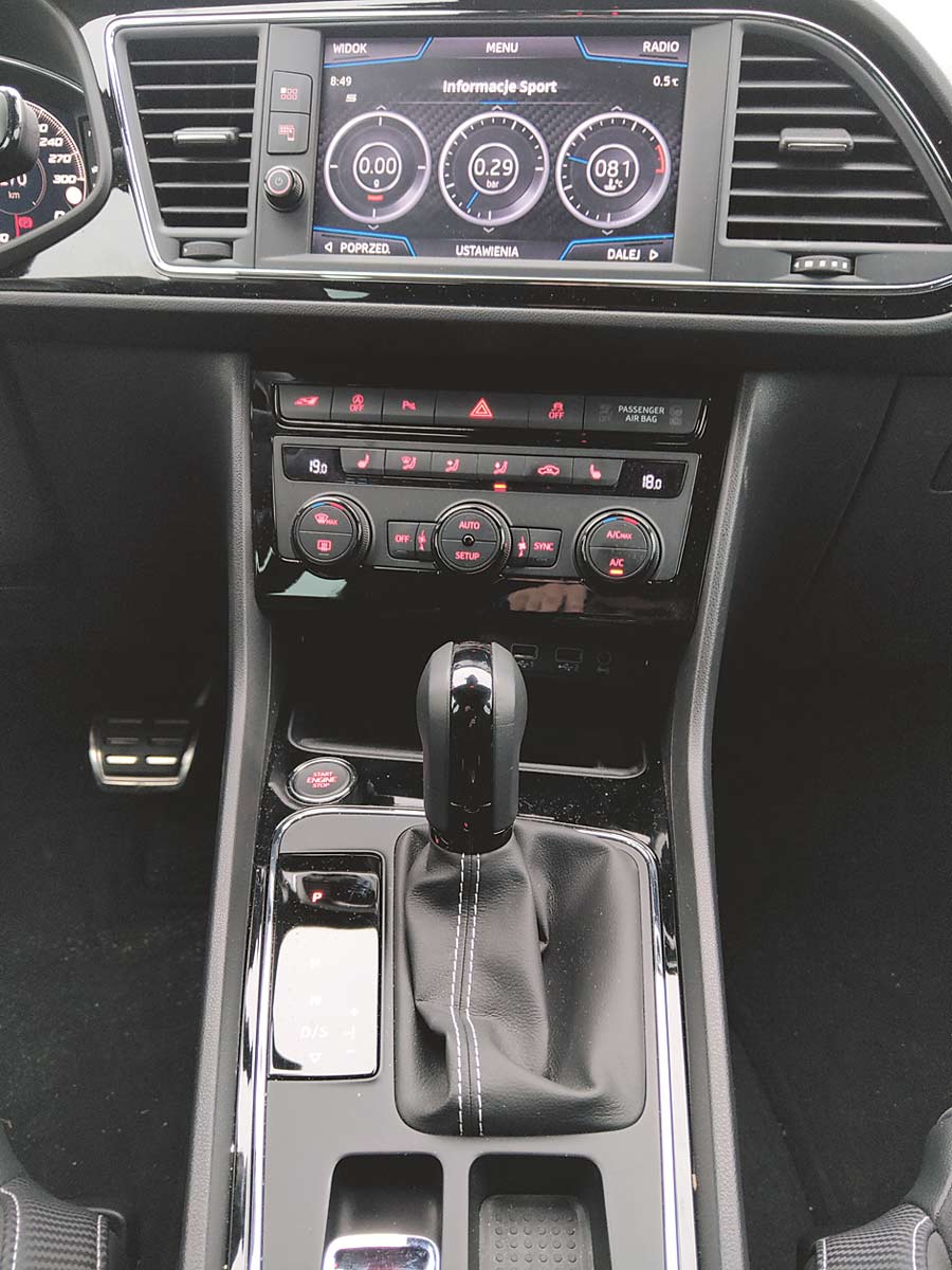 Pod względem spasowania i jakości zastosowanych materiałów jest nieźle. Kokpit Seata to wzór prostoty – czarna deska rozdzielcza jest podzielona na dwie części – w górnej mamy „volkswagenowski” wyświetlacz nawigacji, radia, telefonu i ustawień samochodu, niżej zaś tradycyjny panel do sterowania klimatyzacją. Trójramienna kierownica ma idealną wręcz grubość wieńca i charakterystyczną, wypukłą część środkową oraz ścięty dół. Wszystko to razem nie tylko fenomenalnie leży w dłoniach, ale też i świetnie wygląda.