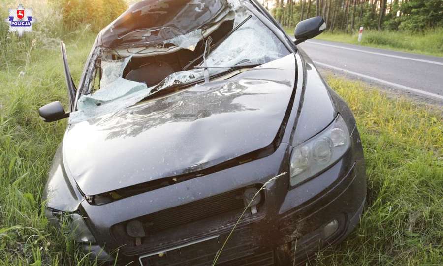 O godz. 2 w nocy przed jadące w kierunku Lublina volvo nagle wtargnął łoś. Doszło do zderzenia. Auto wylądowało w rowie i zostało poważnie rozbite. Ważące ponad 400 kilogramów zwierzę wybiło przednią szybę i rozerwało dach.