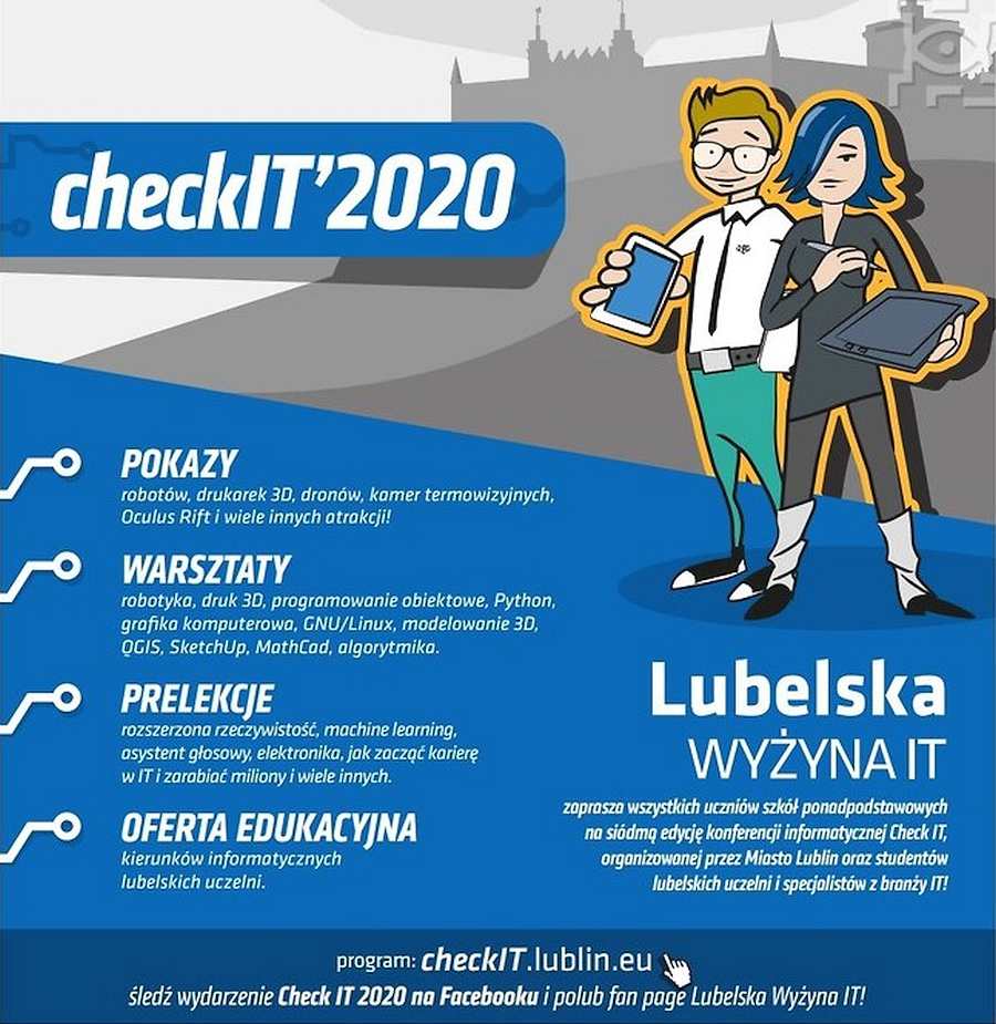 – Celem konferencji jest zainteresowanie młodzieży informatyką i kierunkami pokrewnymi; przekonanie uczniów, że warto studiować na lubelskich uczeniach, a także podkreślenie atrakcyjności dynamicznie rozwijającej się lubelskiej branży IT. W ramach konferencji Check IT odbędzie się także wydarzenie skierowane do uczniów szkół podstawowych Check IT Junior – mówi dr Mariusz Sagan, dyrektor Wydziału Strategii i Przedsiębiorczości Urzędu Miasta w Lublinie.