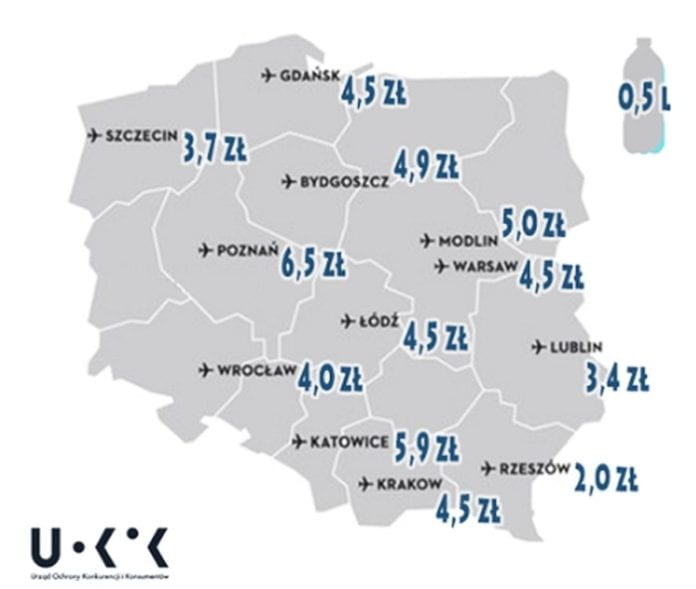 Kontrola wykazała, że na siedmiu polskich lotniskach, w strefie wolnocłowej, można półlitrową butelkę najtańszej wody kupić za mniej więcej euro. Ta stawka – jak podaje UOKiK – jest zgodna z wytycznymi Airports Council International i z rekomendacją Komisji Europejskiej. Z porównania wynika, że Port Lotniczy Lublin oferuje jedną z niższych cen za wodę, czyli 3,40 zł. Taniej jest tylko w Rzeszowie, gdzie za wodę zapłacimy ok. 2 zł. Najwięcej płacą zaś za nią podróżni w Poznaniu (6,50 zł), czy Katowicach (5,90 zł).