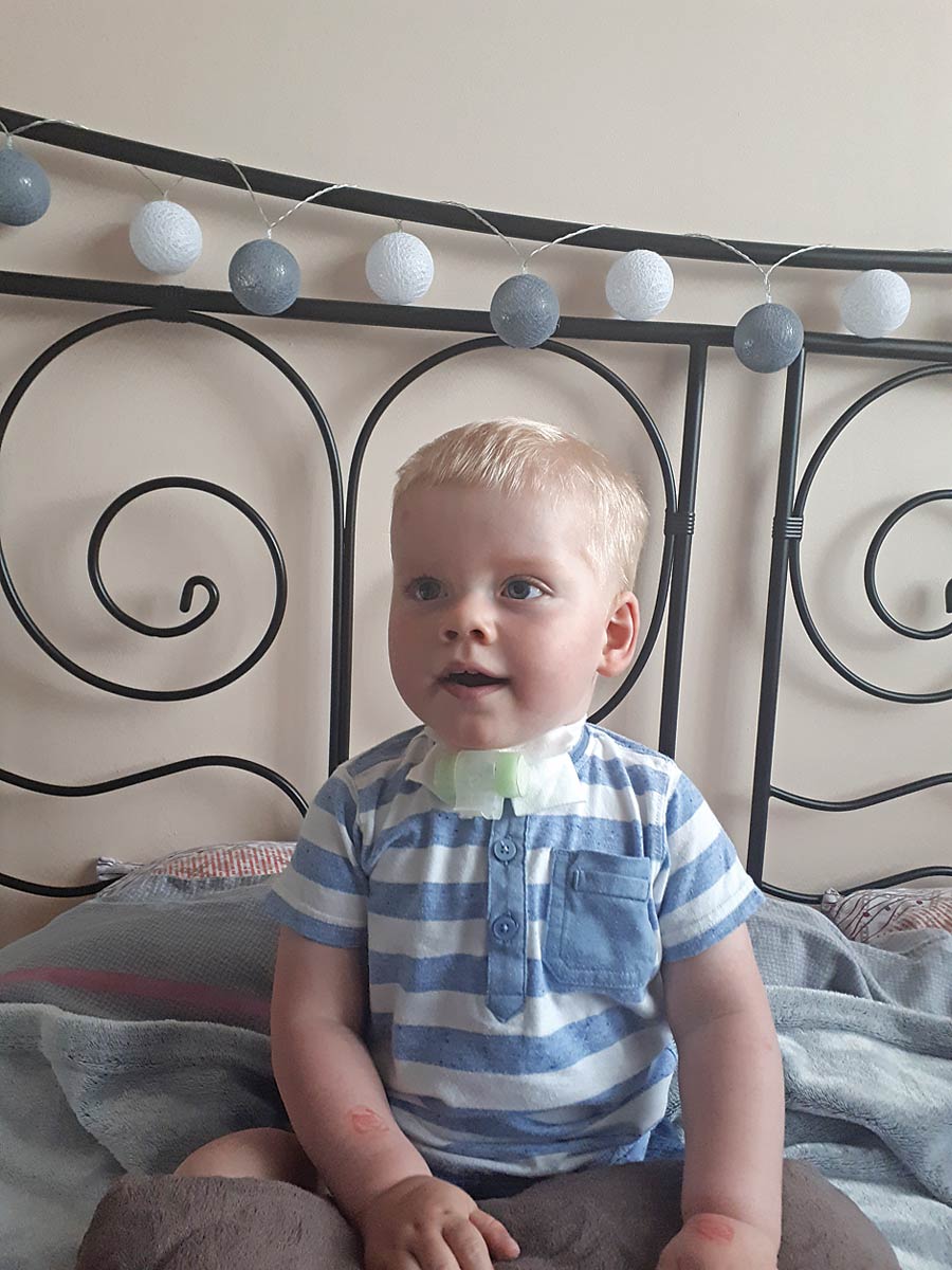 – Staliśmy nad jego łóżeczkiem i płakaliśmy. Dopiero po tygodniu ogólny stan zdrowia się poprawił, parametry wzrastały, ale dalej walczyliśmy z zapaleniem płuc. Miłoszek przeszedł cewnikowanie serca i dwukrotną plikację przepony. Tyle cierpienia i bólu naszego synka i strach o każdy kolejny dzień – ze łzami w oczach opowiada mama chłopca. – I wtedy Miłoszek przeszedł udar niedokrwienny. Doszło do porażenia lewej strony ciała. Jego rączka i nóżka były wiotkie jak szmatka. Po intensywnej rehabilitacji oddechowej i ruchowej nastąpiła poprawa stanu zdrowia i udało się przywrócić sprawność ruchową sparaliżowanej strony. Po czterech miesiącach walki i rehabilitacji mogliśmy wrócić do domu. Życie nie było łatwe, musieliśmy nauczyć się opieki, pielęgnacji, odsysania i wymiany rurki tracheostomijnej. Miłosz ciągle chorował, wymagał częstej antybiotykoterapii i równie częstego podłączenia pod tlen. Z nadejściem wiosny ustąpiły ciągłe infekcje. Miłosz czuje się lepiej. Zregenerował się lewy fałd głosowy i mogliśmy zmniejszyć rurkę na mniejszą. Dzięki temu możemy go usłyszeć, wydaje dźwięki, krzyczy i zaczyna mówić.