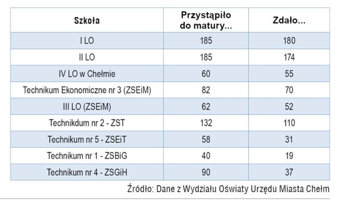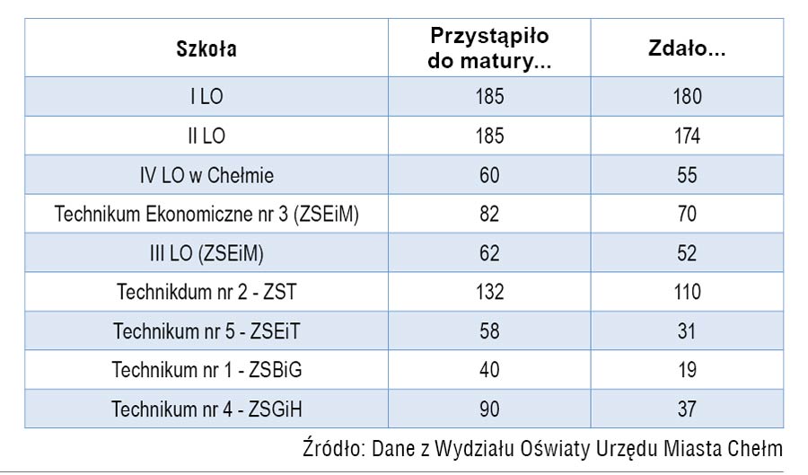A oto zdawalność egzaminu dojrzałości w pozostałych chełmskich szkołach, którą podaje OKE: IV LO – 90 proc., Technikum Ekonomiczne nr 3 – 85 proc., III LO – 84 proc., Technikum nr 2 przy ZST – 81 proc., Technikum nr 5 przy ZSEiT – 48 proc., Technikum nr 1 przy ZSBiG – 44 proc. i Technikum nr 4 przy ZSGiH – 41 proc.