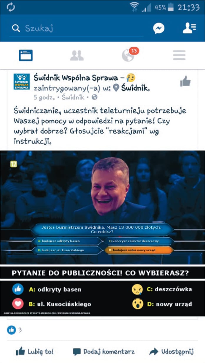 Czy budowa nowego ratusza za 13 mln złotych była najpilniejszym i potrzebnym wydatkiem, czy widzimisię chcących luksusu włodarzy? Dyskusja na ten temat rozgorzała po umieszczeniu przez krytykujące władze miasta stowarzyszenie Świdnik Wspólna Sprawa memu z burmistrzem Waldemarem Jaksonem w roli uczestnika „Milionerów”. Sam burmistrz do, jak to określa, ataków internetowych hejterów nie chce się odnosić.