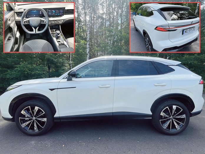 MG HS 1.5 prezentuje się jako nowoczesny i dynamiczny SUV, którego sylwetka łączy elegancję z wyraźnym charakterem miejskiego auta. Nadwozie ma niemal 4,7 metra długości, co plasuje go wśród większych modeli w segmencie kompaktowych SUV-ów. Smukła linia dachu i lekko opadająca ku tyłowi sylwetka nadają autu proporcje zbliżone do samochodów klasy średniej, jednocześnie zachowując przestronność wnętrza. Przód samochodu wyróżnia się charakterystycznym grillem w kształcie trapezu, który w wersji benzynowej jest otoczony chromowaną ramką, nadającą pojazdowi elegancki, ale nieprzesadzony wygląd.