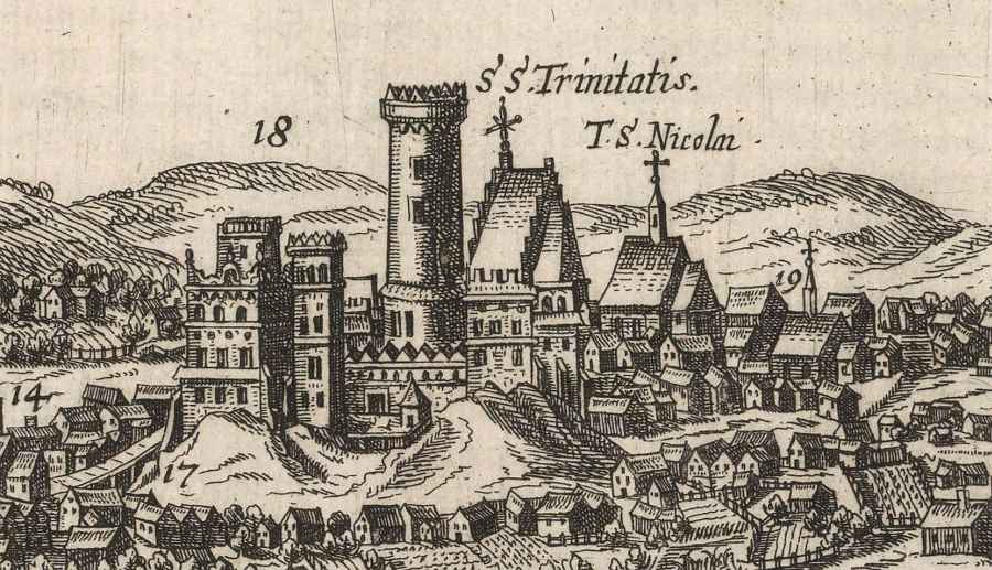 – Malowidło w kamienicy Lubomelskich przedstawia obraz miasta, który został wykonany jeszcze przed wielkim pożarem w 1575 roku. Wśród budowli został umieszczony również zamek, widoczne są mury obronne, szczyt kościoła zamkowego, dwie wieże kryte wysokimi dachami oraz stojąca między nimi budowla kamienna, która mieściła: sale, komnaty, sienie – mówiła dr Jakimińska. W „Civitates orbis terrarum” pojawił się również opis.
